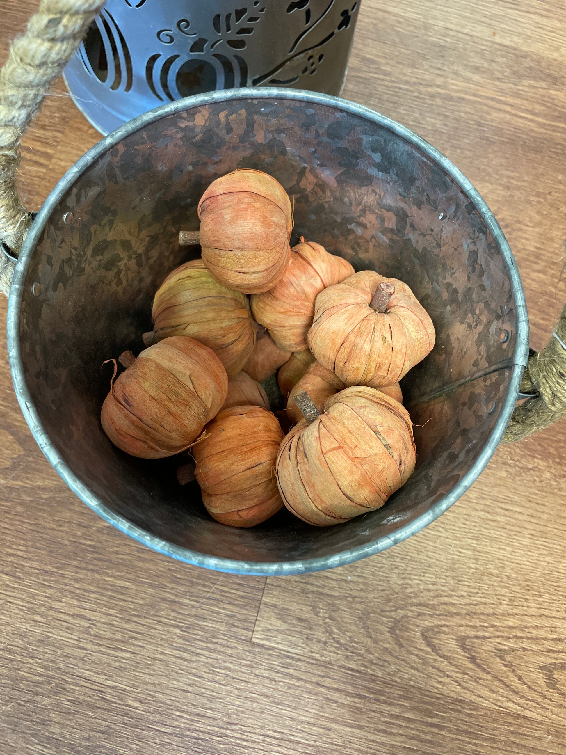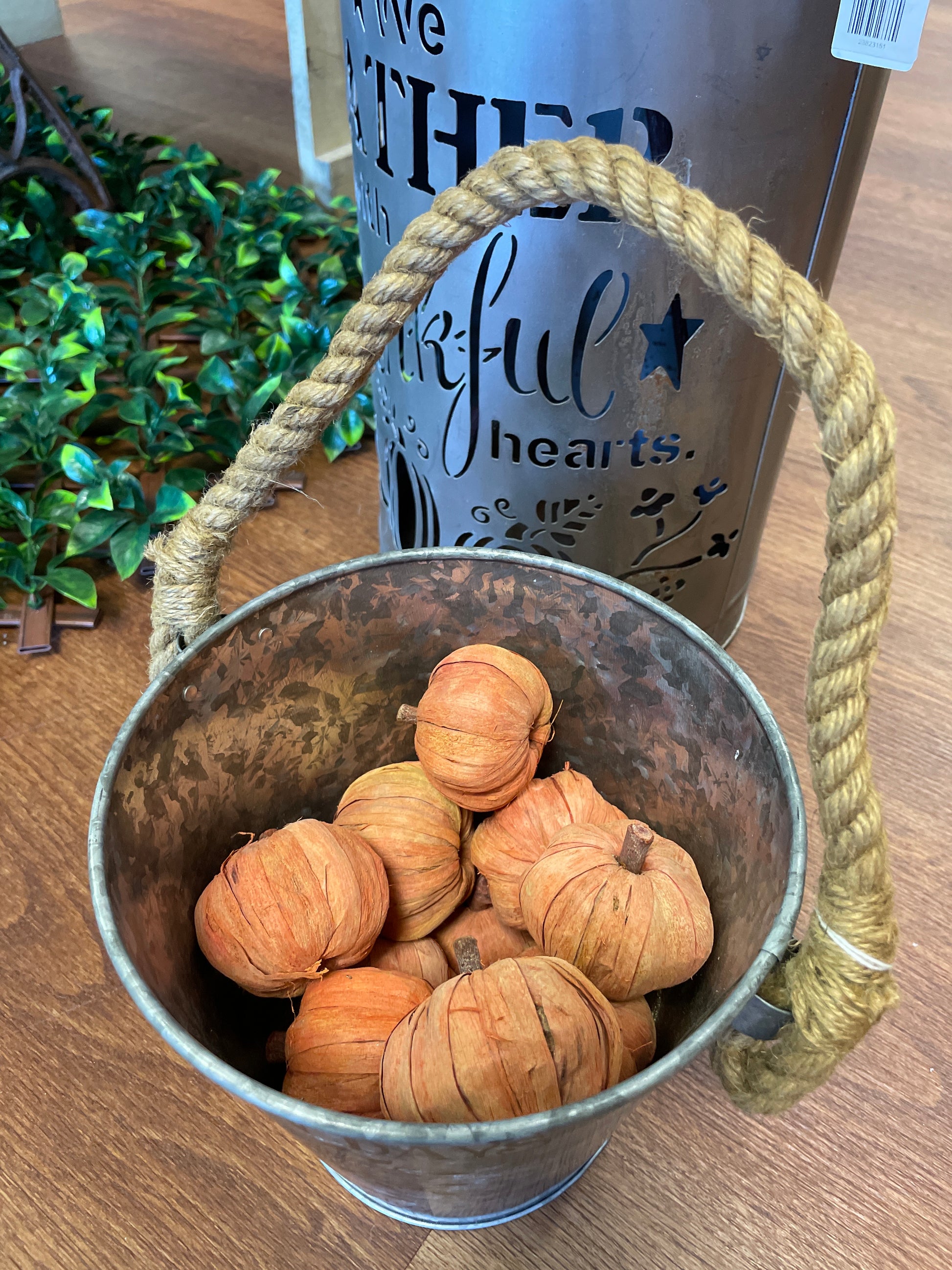 This galvanized bucket is perfect for cozy autumn days. Featuring a playful "Autumn Days are Here Again" quote on the front and a rustic rope handle. But the real treat? The cinnamon scented pumpkins inside, bringing all the fall vibes.
