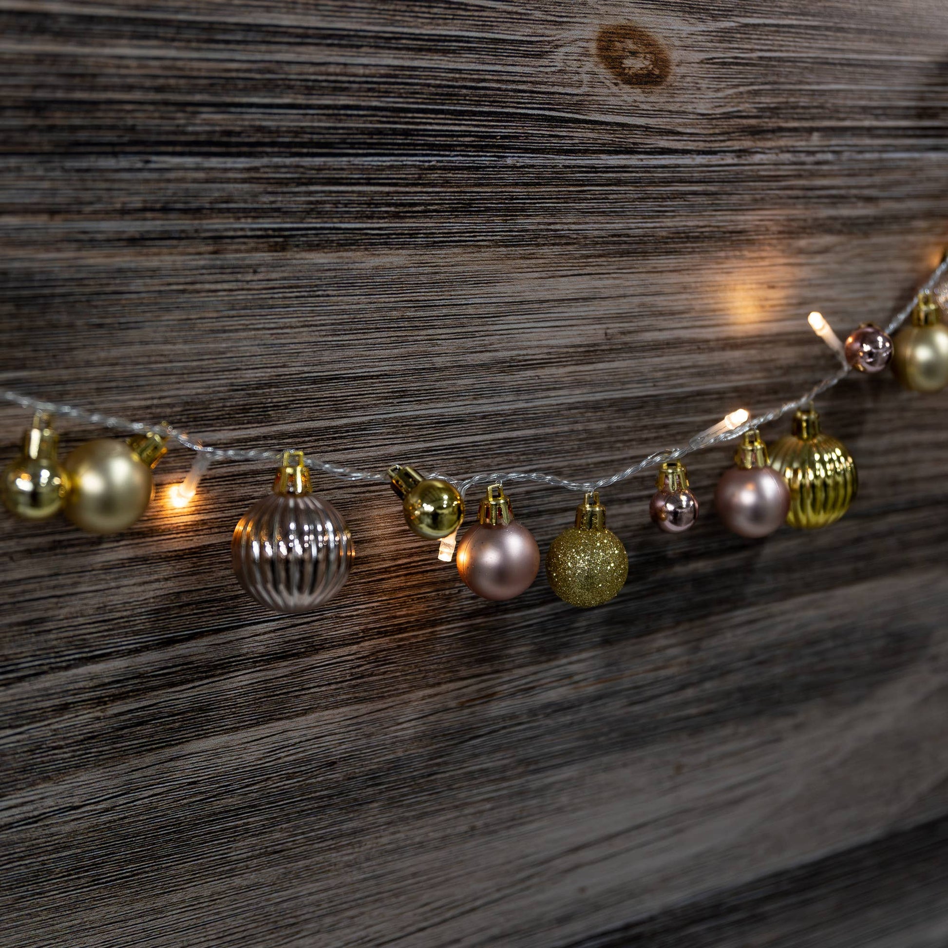 Battery Operated String Lights with Christmas Ornaments add a touch of elegance to your indoor holiday décor. The glowing warm white LED lights shining amongst the gold and rose gold ornaments create lovely, ambient lighting.