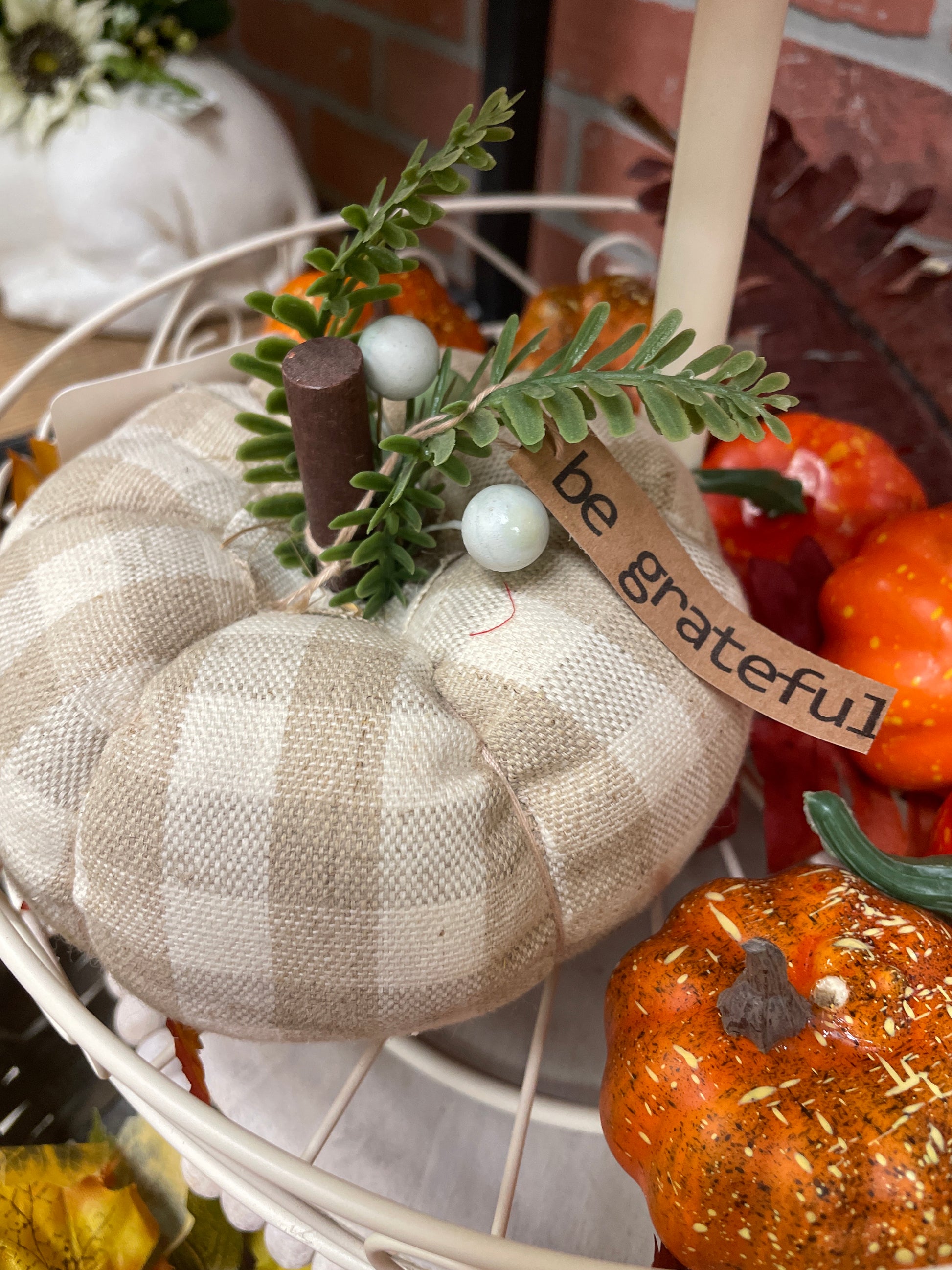 Add a cozy touch to your Thanksgiving decor with the Be Grateful Pumpkin! This soft fabric pumpkin features a neutral plaid pattern, lush greenery, and a charming "Be Grateful" tag. Perfect for sprucing up a tiered tray, shelf, or as a thoughtful hostess gift, this little pumpkin brings harvest warmth and gratitude in a playful, stylish way.