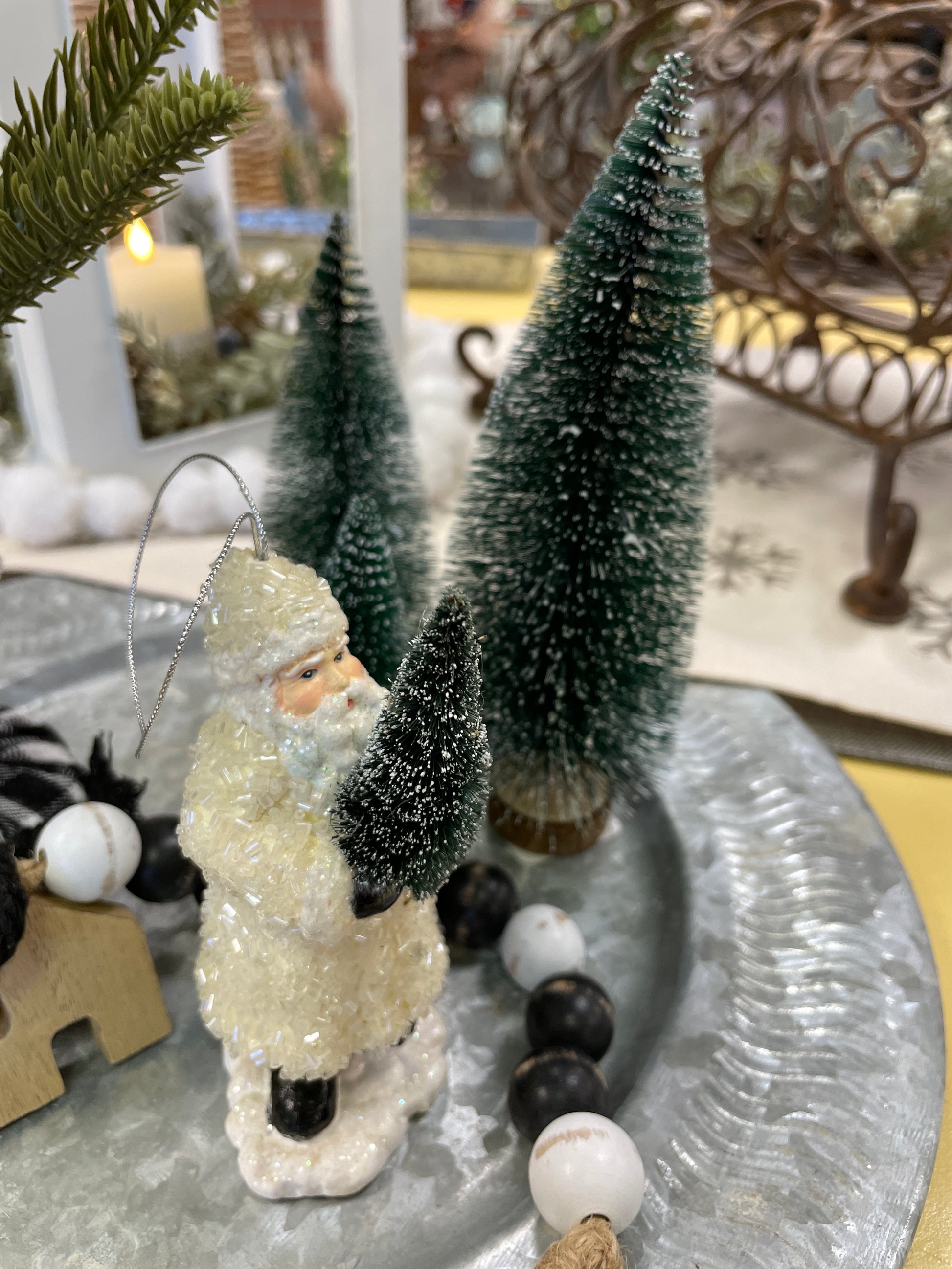 Bring festive cheer to your tree with this charming Beaded Santa figurine! Standing 4 inches tall, this delightful ornament features a jolly Santa clutching a lush evergreen sprig, complete with a sparkly beaded coat and hat that catches the light beautifully. The intricate beadwork adds texture and shimmer, giving this winter wonder a magical, eye-catching appeal. Perfect for collectors or as a standout decoration that sparks holiday joy wherever it's displayed.