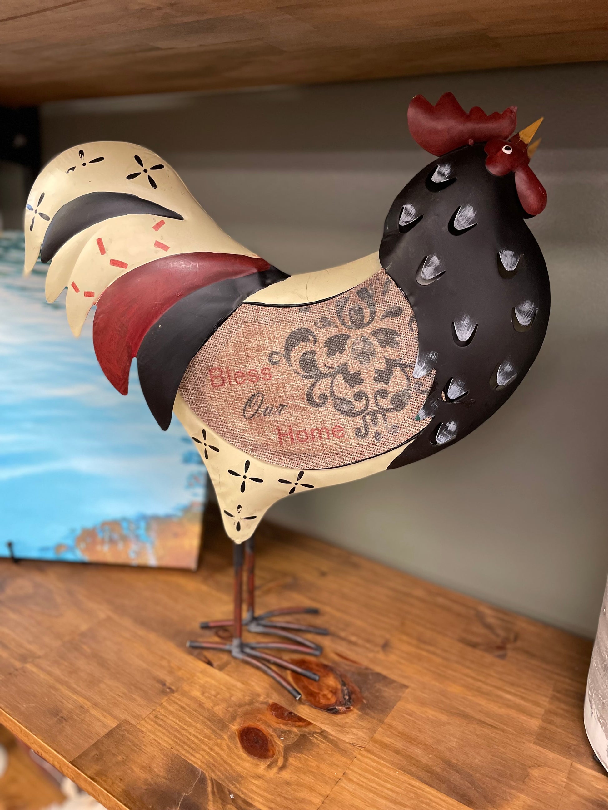 Standing 18” tall, this Rooster brings a charming, playful touch to your décor. Crafted from painted metal with gorgeous detail, it features a rustic burlap embellishment that reads "Bless our Home" and adds warmth and character. Perfect for adding a dash of farmhouse fun to your space!