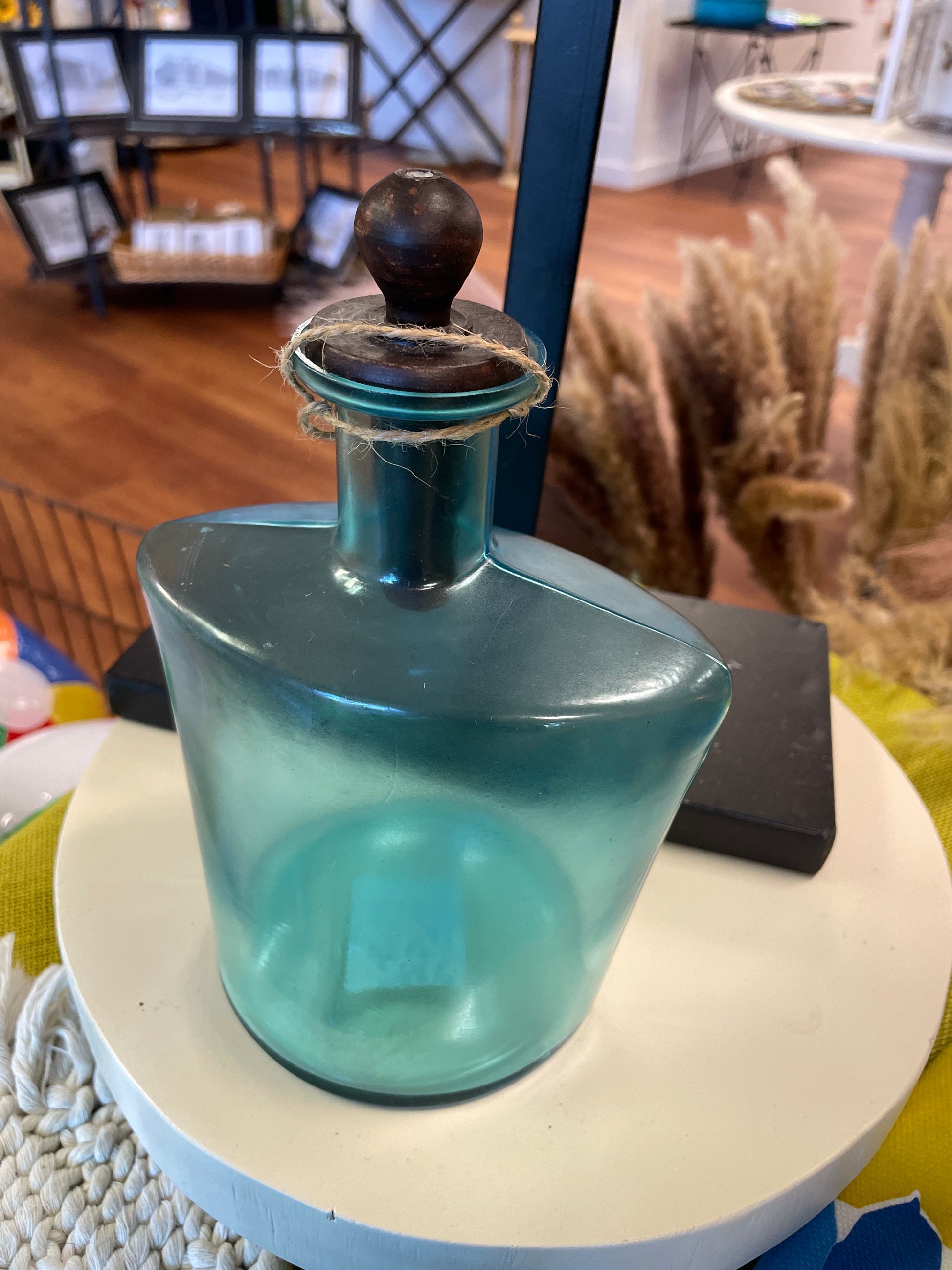 Add a splash of seaside charm to your bathroom with this clear blue bottle topped with a wooden stopper. Its lovely blue hue and beachy vibe make it a perfect decor piece for lakeside or coastal-inspired spaces. Display it proudly and let its playful color brighten your day!
