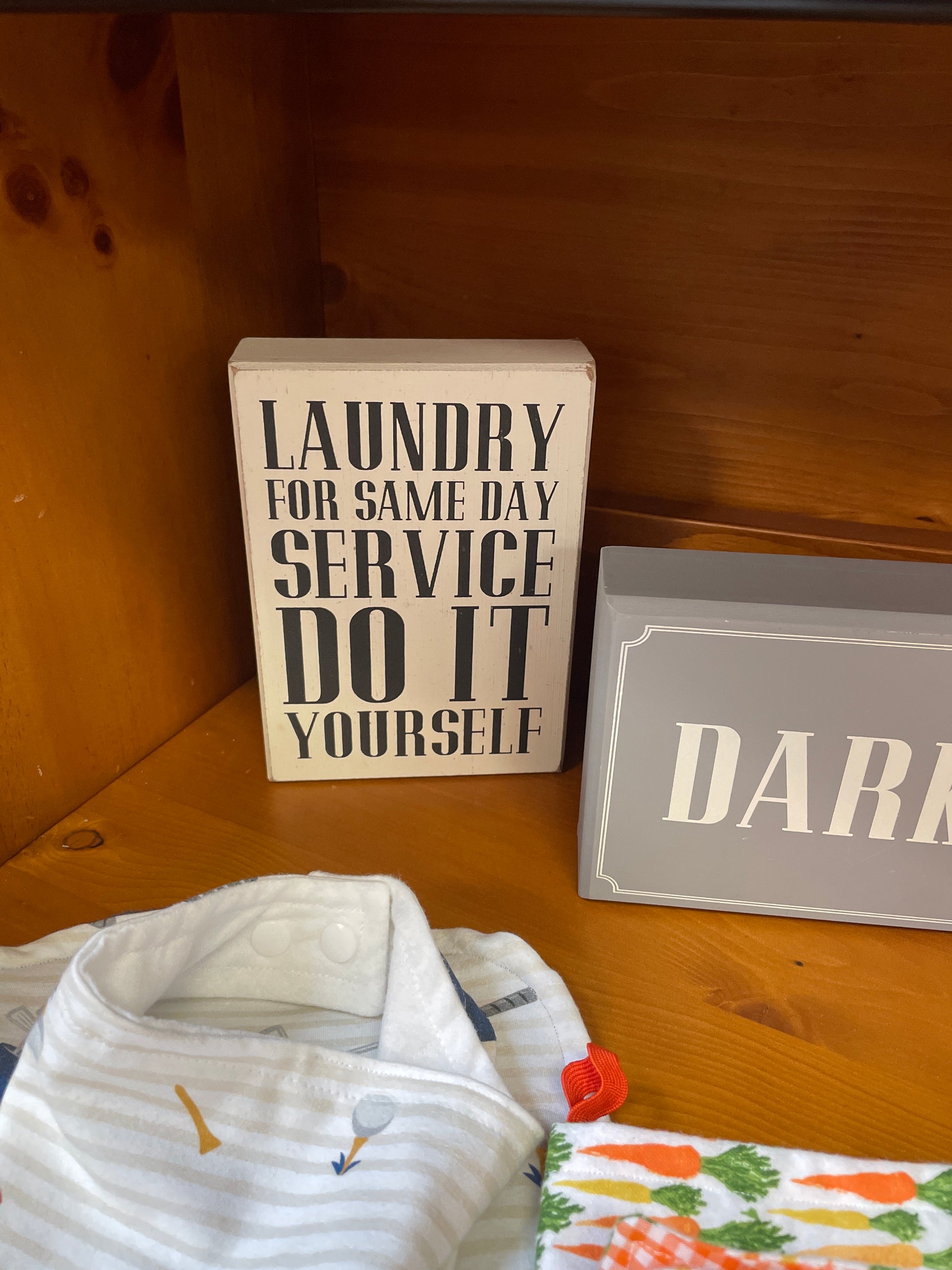 Bring a fun, farmhouse vibe to your laundry space with this white distressed wooden "Laundry Same Day Service" word block. Whether you hang it or let it sit on a shelf, it adds a playful reminder that laundry day is all about quick, do-it-yourself service with style.