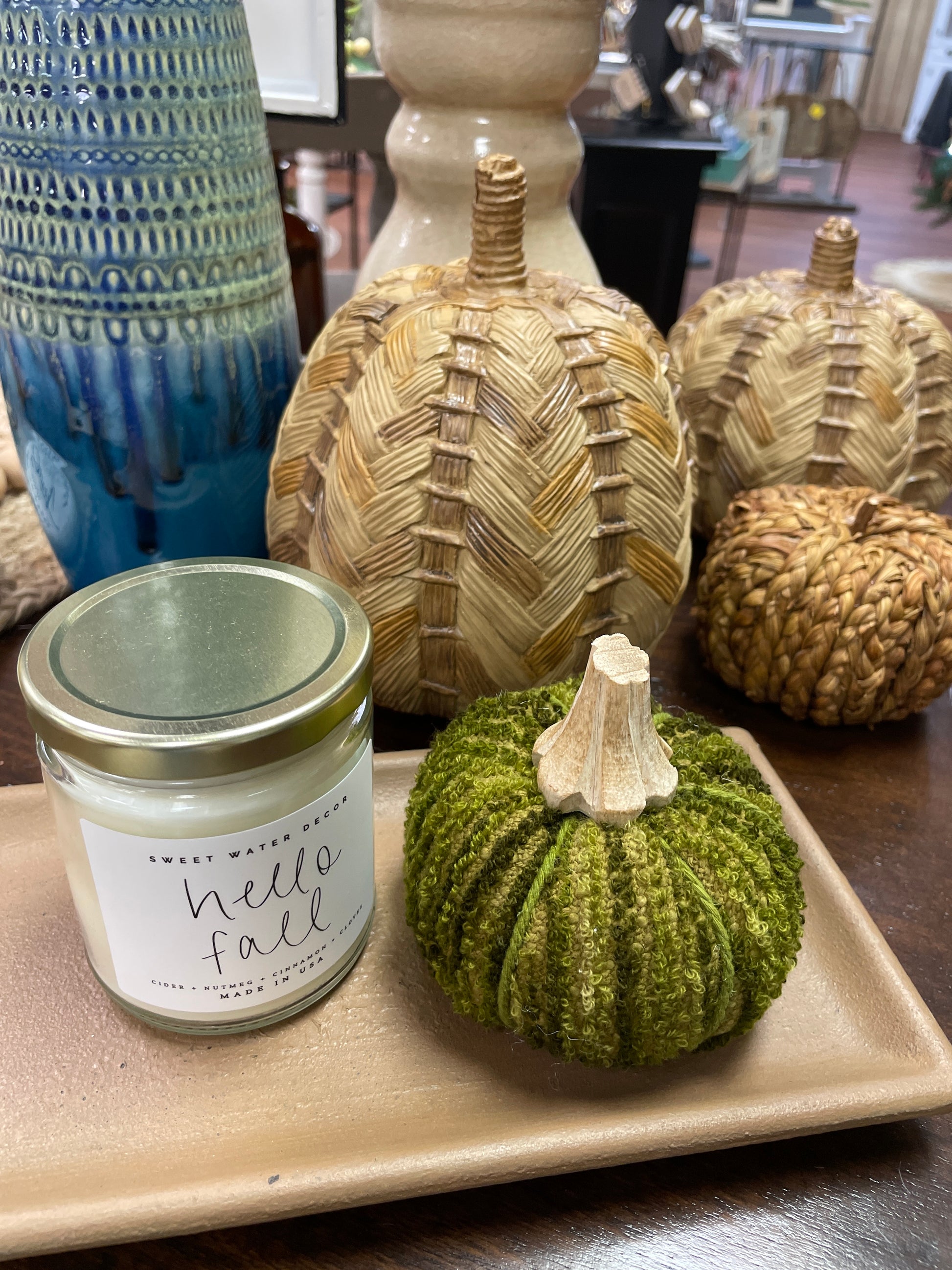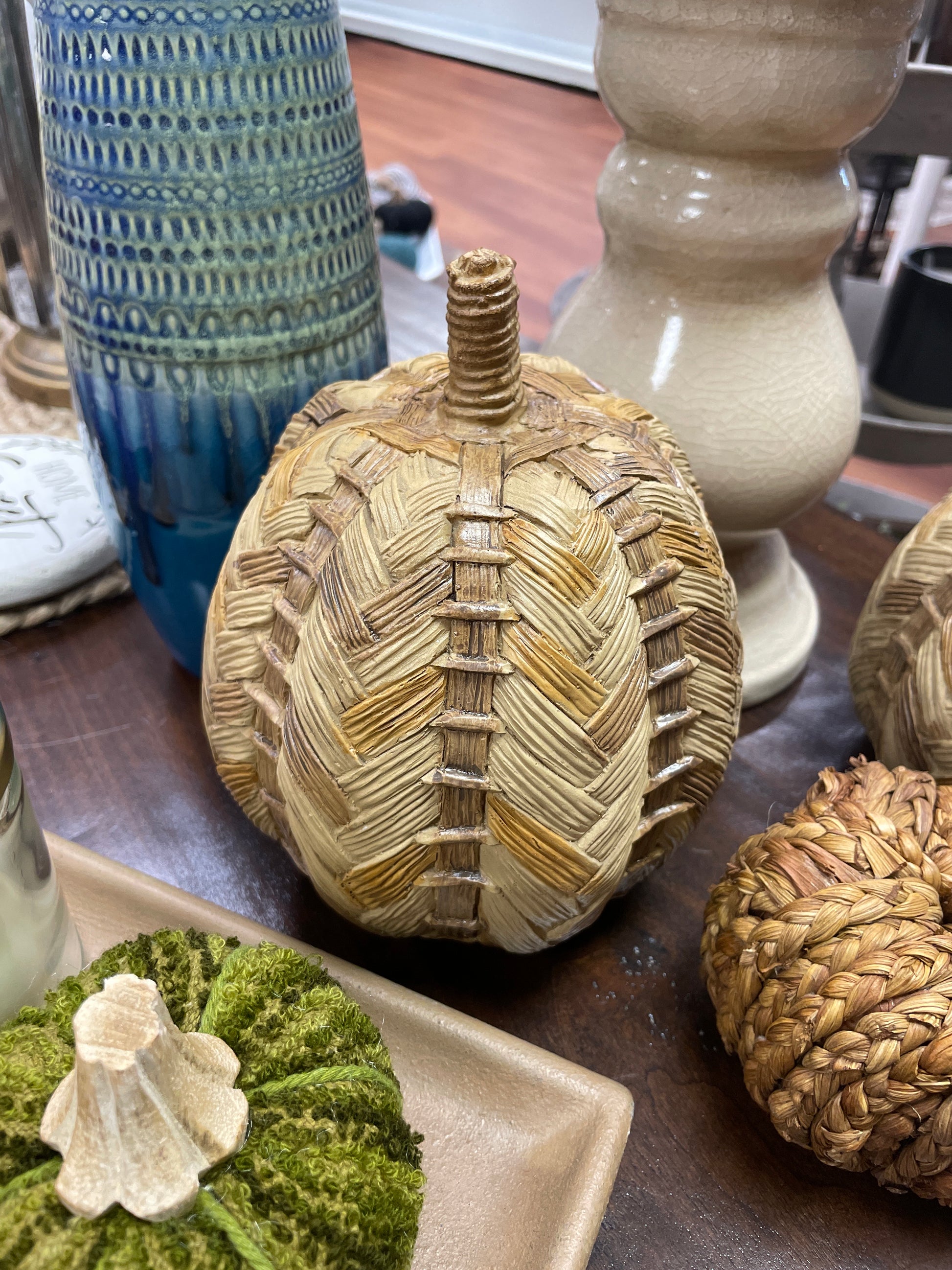 Add a touch of nature to your home decor with our Resin Woven Pumpkin. Its unique woven design and neutral tones make it the perfect addition to any tabletop, mantle, shelf, or desk. Made of durable resin, this pumpkin is sure to bring a playful touch to any space. (Pumpkin spice latte not included.) (Pair with the Smaller pumpkin for a great display)