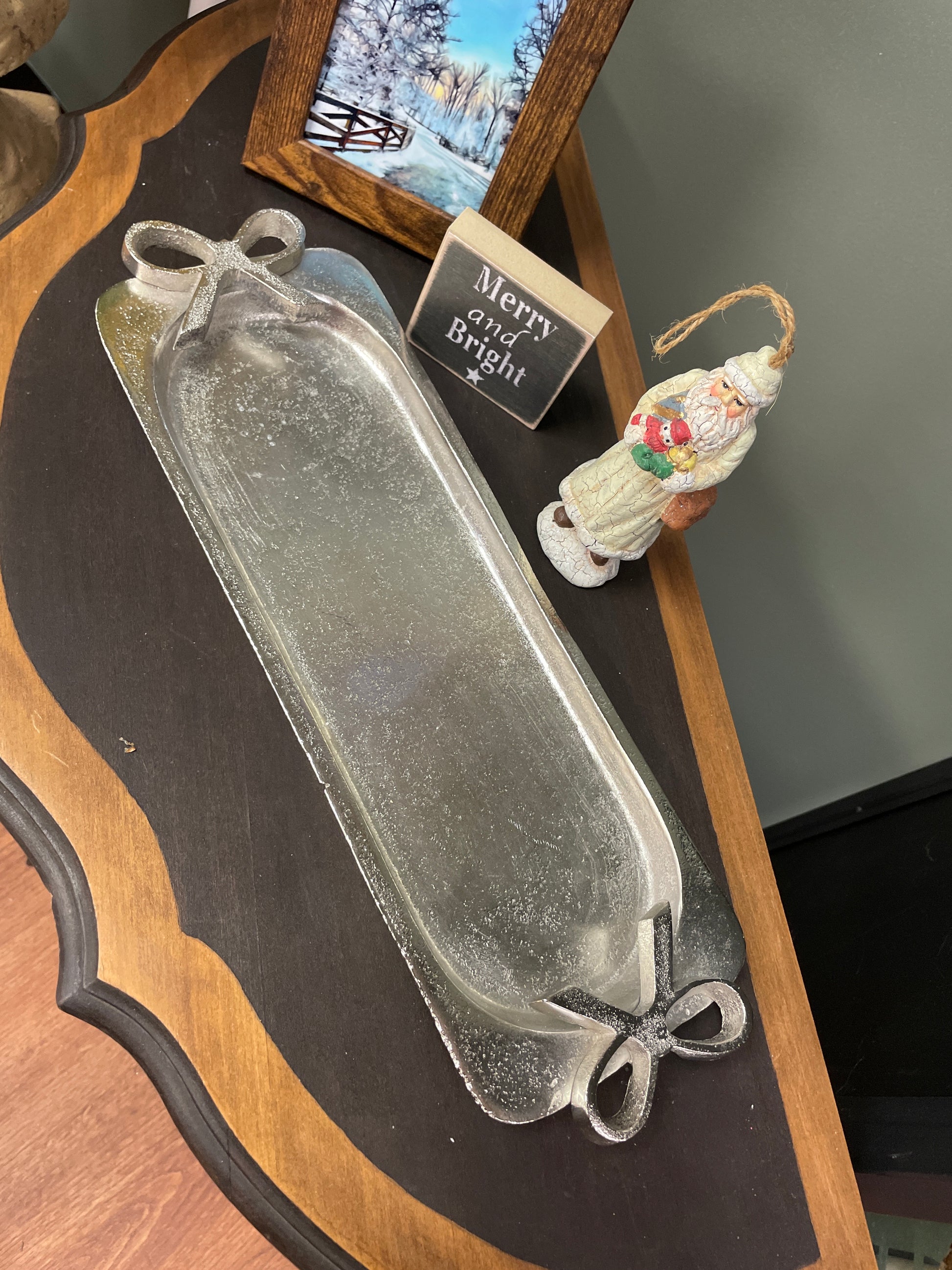 Meet your new favorite serving companion! This substantial silver tray features charming bow handles that are as functional as they are fabulous. Built from weighty metal with a gorgeous silver shine, it's sturdy enough for all your entertaining needs—whether you're whisking treats around at a party or showcasing goodies at your next event. Those adorable bows aren't just for looks; they give you a comfortable grip while adding a delightful flourish to any table. Serve with style and a smile!