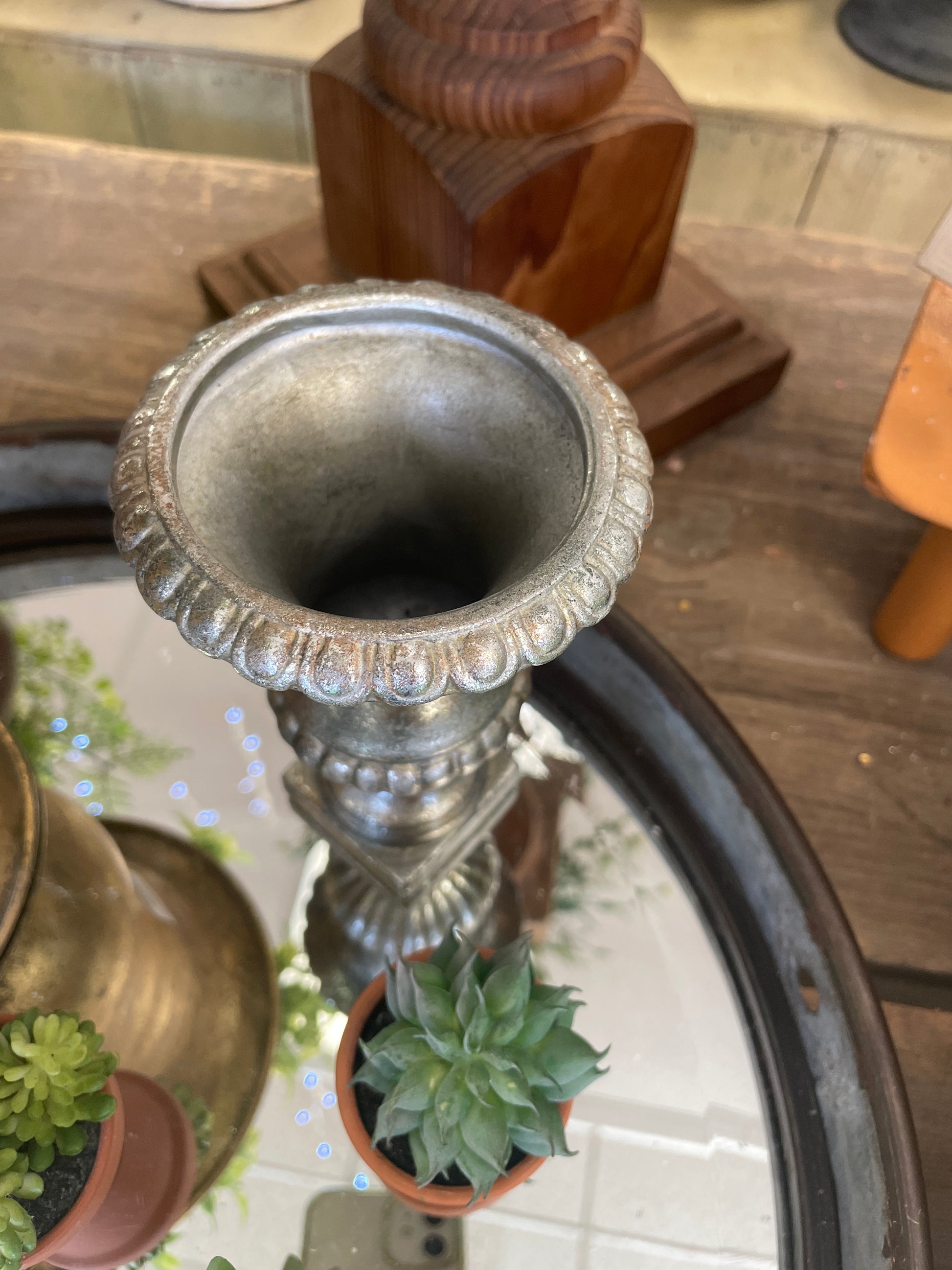 This decorative small Silver Urn stands at 6" tall and adds a touch of class to any room. Its compact size makes it perfect for smaller spaces, while the silver finish gives it a cute and stylish look. A must-have for any decor!