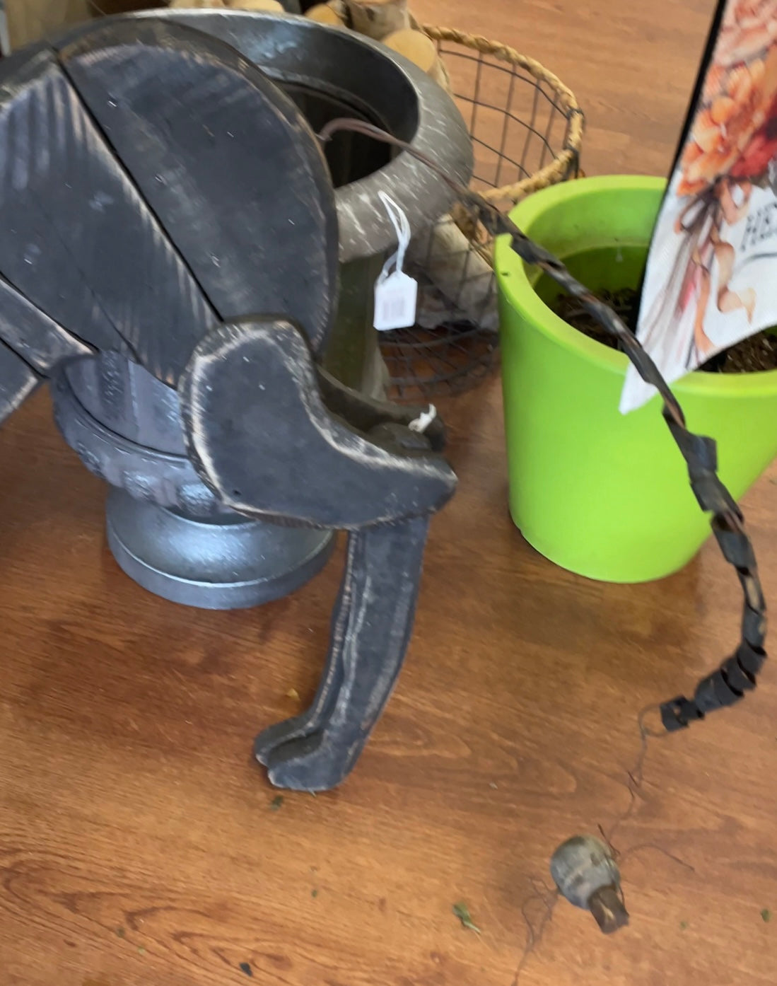 This playful wooden black cat stands about 2 1/2 feet tall, perfectly blending wood and metal craftsmanship. Its ears are crafted from metal, and a dangling metal tail ends with a little spider, adding a spooky charm. The cat’s striking eyes give it a mischievous, mysterious look—ideal for adding a fun, Halloween vibe to your decor.